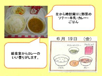 6月19日(金)は牛乳・野菜のソテー・カレーでした。野菜のソテーは,スチームコンベクションオーブンで野菜を蒸しているので,野菜の甘みが感じられ,薄味でもおいしく食べることができます。