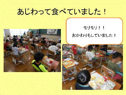 カレーは給食室でルウから手作りしています。10時ごろになると,カレー粉を炒める良い香りがしてきて,献立を言わなくても「今日はカレーやろ」と楽しみにしていました。ごはんの残りもいつもをより少なく,しっかり食べてくれていて,とてもうれしいです。これからどんどん暑くなり,食欲が落ちるころですが,夏バテしないようにしっかり食べて欲しいです。