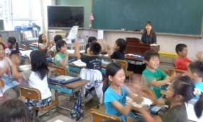 3年生の教室から先生のオルガンに合わせて楽しい歌声が聞こえてきました。歌声と同時に二人一組になって手を合わせてリズムとり。「夏も近づく八十八夜,(パチパチ)」と,明るい笑顔と楽しい歌声が響きました。