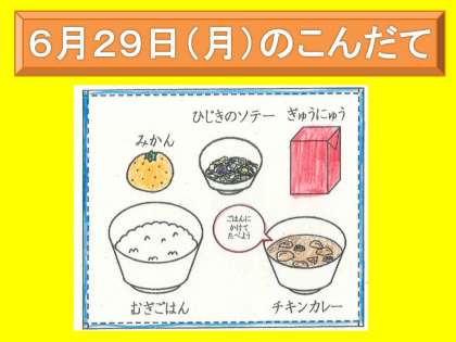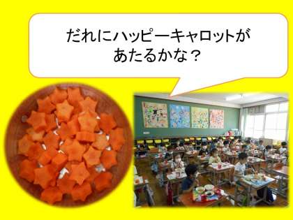 6月29日(月)は,牛乳・麦ごはん・ひじきのソテー・チキンカレーでした。チキンカレーの中に,各クラス2つずつ星の形をしたにんじんを入れました。以前クリームシチューが出たときに,6年生の児童は,「今日はハッピーキャロットですか?」と聞いてくれ,「いつハッピーキャロットなんだろう」と楽しみにしてくれているようでした。1年生にとっては初めてのハッピーキャロットで,「入っているかな?」と楽しそうに探していました。