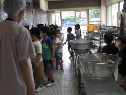 昨日の生活科の学習は,学校探検。給食室をクラスごとに探検しました。3校時,給食調理員さんが,ものすごい量の野菜を切る様子や,大きな大きな鍋で調理する様子を見ることができて,みんな目を輝かせていました。