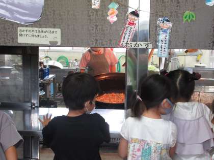 「お鍋が,思っていたより大きくて,びっくりしました。」「想像していたよりも,野菜(材料)がたくさんあって,驚いたよ。」「鍋の中をかき混ぜる道具が,家のものより大きくて,びっくりしたよ。」……教室に帰ってから,たくさん感想を発表していました。探検をした後の給食時間,いつも以上にもりもりと食べていたような気がします。