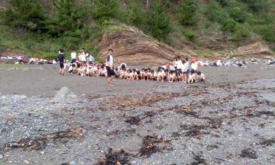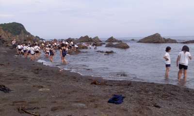 宮崎浜での磯浜観察。京都に住んでいるとなかなか海で遊ぶという経験はできません。子どもたちは,思う存分海での活動を楽しみました。少し冷たい海水もなんのその。晴れ間も見えて,絶好の磯浜観察になりました。4時半過ぎに終わり,みさきの家に帰り足を洗いました。入浴・夕食後はお楽しみのキャンプファイヤーです。まだまだ楽しみは続きます。