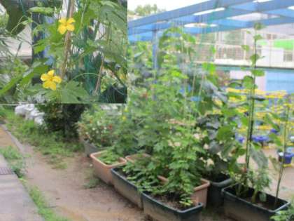 ふと理科室の外を見てみると,4年生が育てているツルレイシが