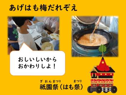 祇園祭りは別名「はも祭り」といわれ京都の夏に,「はも」は欠かせない食材です。今年は残念ながら,祇園祭りの山鉾巡行はなくなりましたが,給食を通して少しでも行事や季節を感じてほしいです。「はもがさくさくしておいしい」「うめだれがすっぱい」などの感想がありました。長い梅雨で体が疲れやすい時期ですが,しっかりと食べて元気に過ごしてほしいです。