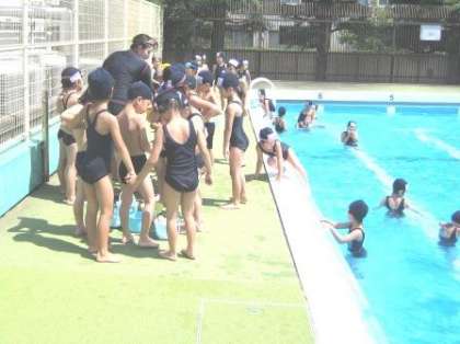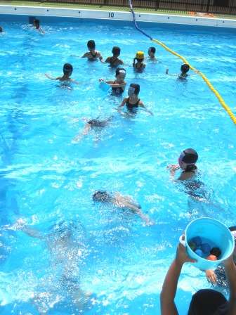 1年生のプール学習です。学習のめあてを張っていて低学年は水になれることから始めます。水の中にもぐって底に沈んでいるボールをとってきます。誰が一番たくさんとってくるか競争しています。おひさまが照る中で,とても気持ちのよいプール学習。先生の言うこともきちんと聞いて学習しました。