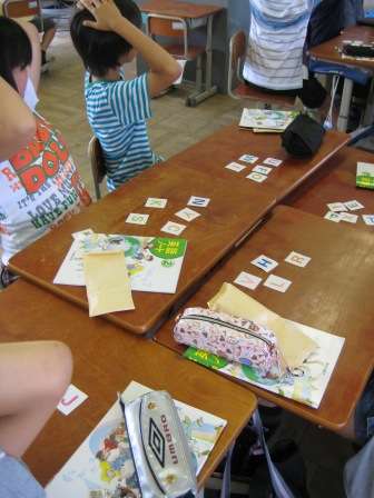 担任の先生が英語で子どもたちに「 Next word 」と指示します。お手付きのないように手を頭に乗せて先生の次の言葉を待ちます。「Left T」と言うと子どもたちは「T」の文字の右の言葉を探し,早く探した人がそのカードを勝ち取ります。