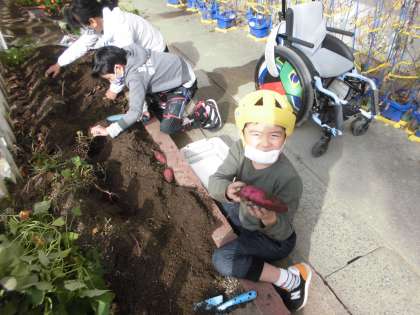 おいもの収穫をしました。畑を掘って見ると,おいもが顔を出しました。手で丁寧に土をのけて行きました。大きなおいもが出てきました。大きいおいもと小さいおいもととで,全部で25個収穫できました。たくさん収穫できて,みんな嬉しそうでした。おいものツルでリース作りをしました。くるくる巻いてリースができました。おいもは,2カ月ほどおいて置くと美味しくなるそうです。2カ月後に焼きいもにして食べることに決まりました。2カ月後が楽しみです。