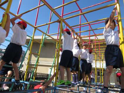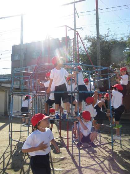 学年別スポーツ大会も終わり,1年生は体育科の時間に,遊具で楽しく安全に遊ぶための学習をしているところです。「わにさん ぱっくん(しっかりと握る)」「3点固定」「遊具の上でおにごっこやボール遊びをしない」など,約束を確認し,楽しく,でも,慎重に練習をしているところです。