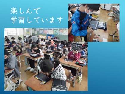 算数科を中心にタブレットを活用した授業に取り組んでいます。自分の考えをタブレットに書きこみ,画面を見せながら友達に説明をしたり,グループで話し合ったりします。また,自分の書きこんだシートを担任に送って提出し,クラスの友達の提出したシートを自分のタブレットで選んで,互いに見合ったりすることもできます。