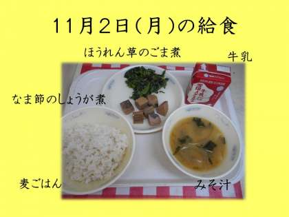 11月2日(月)は麦ごはん・牛乳・なま節のしょうが煮・ほうれん草のごま煮・みそ汁でした。なま節は,しょうががふんわりと香り,しょうゆなど調味料が,よくしみ込んでいて,ごはんによく合うと好評でした。ほうれん草のごま煮は,「シャキシャキして,いいにおいです。レシピが欲しいです」という感想もあり,味わって食べてくれている様子でした。肌寒くなり,温かい給食を心待ちにしている児童がたくさんいました。温かい給食で心も体も,温まって欲しいです。