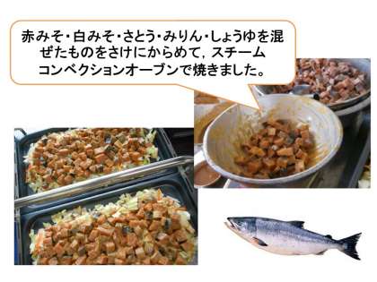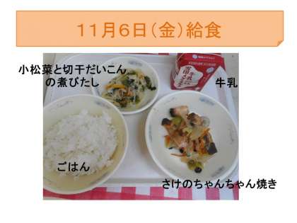 11月6日(金)の給食は,牛乳・ごはん・さけのちゃんちゃん焼き・小松菜と切干だいこんの煮びたしでした。さけのちゃんちゃん焼きは,北海道の郷土料理で,さけに味噌で作ったタレをからめて,野菜と一緒にスチームコンベクションオーブンで焼きました。さけに絡んだ味噌がこんがり焼けて香ばしく,スチームを出しながら焼くので,身がふっくらでおいしいと好評でした。児童の感想には,「みそあじでごはんにあいました。」「やさいがシャキシャキしていておいしかったです。味もさけにしみこんでいました。ごはんとよくあっていました。家でも作りたいのでレシピをください。」など素敵な感想がたくさんありました。ごはんにとても合う献立で,ごはんの残りもほとんどなく,しっかりと食べてくれている様子でした。