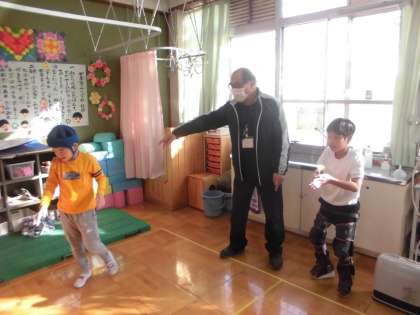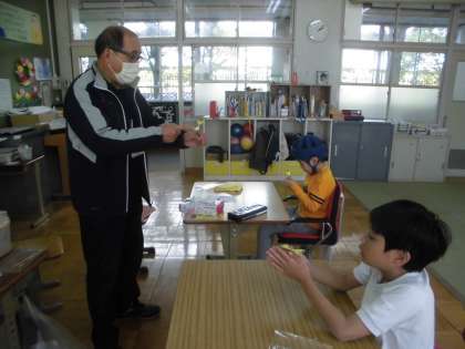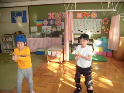 竹とんぼと作って遊びました。初めに,本物の竹とんぼを飛ばしてみましたが,なかなかうまく飛びませんでした。次にプラとんぼを作りました。プラスチックでできた羽で,とても飛びやすいです。竹串にプラスチックの羽を付けて,アイロンビーズで止めました。できあがると,すぐに飛ばし初めましたが,初めはなかなかうまく飛びませんでした。練習すると,ふわっと飛ぶようになってきたので,遠くへ飛ばす競争をしたり,高く飛ばす競争をしました。高く飛ぶ時は天井に届きそうなぐらい,高く飛び,大喜びでした。ブーメランに色をつけて,ブーメラン作りもしました。竹とんぼもブーメランもできて大満足だったようです。