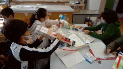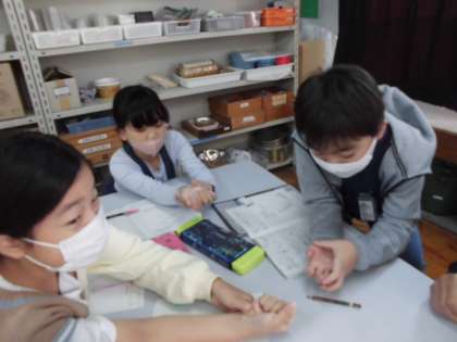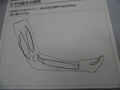 骨や筋肉について学習しました。レントゲンをとった経験を思い出したり,自分のうでをさわったり動かしたりしながら考えていました。また,人体模型で骨の数を見たり,牛乳パックとリボンを骨と筋肉に見立てて動かしたりもしました。自分のことについて,興味深く調べていました。
