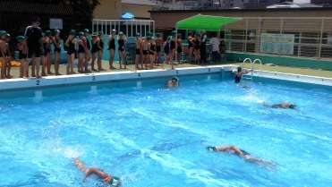 お昼12時過ぎの校舎での子どもたちの様子です。5年生は,25メートルプールを縦泳ぎで何度も挑戦していました。