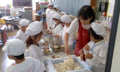 1年生の教室をのぞくと給食の用意で当番の人たちが先生のお手伝いをしていました。