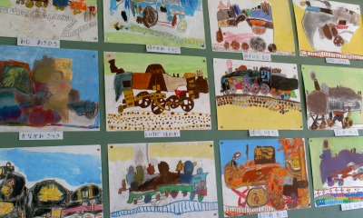 2年生の教室には梅小路機関庫へきかんしゃを写生にいったときの絵がはられていました。個性的で楽しそうな「きかんしゃ」が並んでいます。