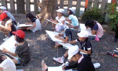 7月15日の暑いさなか,5年生が松尾大社の御旅所へ写生に出かけました。くすのきの陰で,ちょうど日差しをよけ,風の通る砂利の上で,真剣な様子で描く子が多くいました。