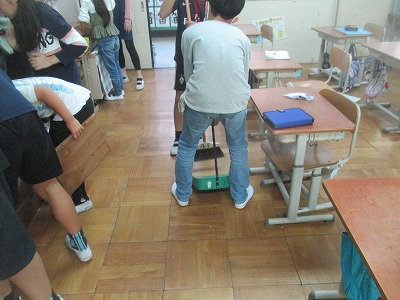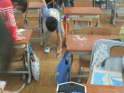 「ほってすって見つけて」の学習に取り組むと,版画版の彫りかすがたくさん出ます。片づけはもちろんみんなで協力して,掃除の時間と変わらないぐらいがんばってきれいにします。