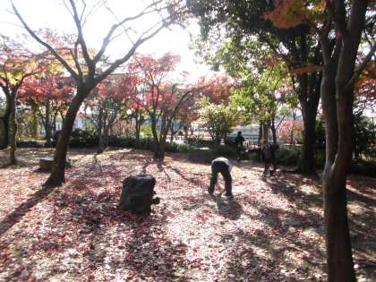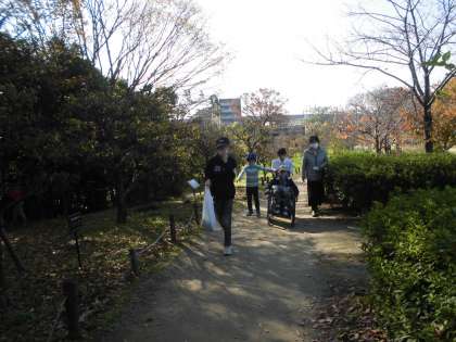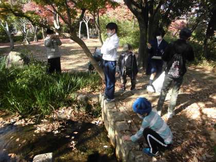 梅小路公園で七条エリア交流会をしました。中学生がリーダーになって秋見つけの,なかよしビンゴをしました。初めに自己紹介をしてから,3グループに分かれて秋見つけをしました。落ち葉を拾ったり,ドングリを拾ったりしました。たくさんの落ち葉やドングリがあり,袋にいっぱい集めていました。川で落ち葉を流して楽しんだり,鳥の声を聴いたりしました。ビンゴカードを見ながら,「ドングリいっぱいひろったよ。」「ビンゴになった。」「赤い花どこかな。」とみんなで秋の景色を楽しんでいました。初めは恥ずかしそうにしていた子たちも帰るころにはすっかり仲良しになり,たくさんお話がしできました。