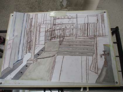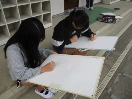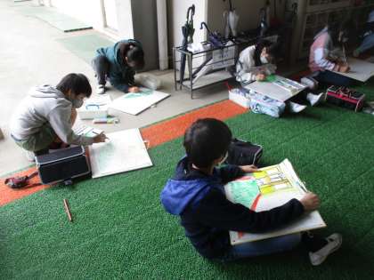 校内で自分の思い入れのある場所を選んで画用紙に描いていました。