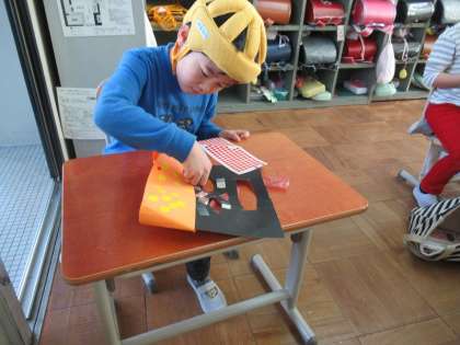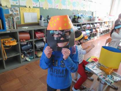 図工で「わっかでへんしん」をしました。わっかを作ってそこから何を作るか考えました。「お面にしたい」というのでどうしたらお面になるか,考えながら画用紙を切りました。わっかに貼り付けて,変身お面ができました。シールやキラキラテープを付けて素敵な,変身お面が完成しました。