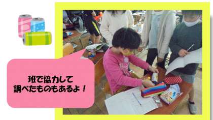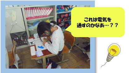 理科の学習で電気を通すものと通さないものがあることを知り,身の回りで電気を通すものにはどんなものがあるのかを調べました。ペットボトルや空き缶,アルミホイルやダンボールなど,さまざまなものを調べ,鉄や銅,アルミニウムなどの金属は電気を通すことを知りました。