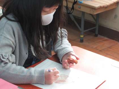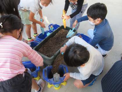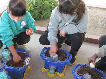 今日は,植木鉢の中に土を入れなおして,チューリップの球根を植えました。教室で,一人一人,球根を手にしたときには,「たまねぎみたい。」「先の方から,何か出ている。もしかして,芽かな。」「友だちのと大きさが違うよ。」「きれいな花が咲いてほしいから,しっかりとお世話するね。」などと言いながら,目を輝かせていました。