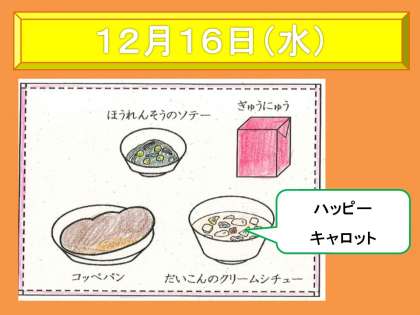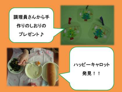 12月16日(水)は,牛乳・コッペパン・だいこんのクリームシチュー・ほうれん草のソテーでした。給食週間の取組の一つとして,ハッピーキャロットを行いました。ハッピーキャロット(星型のにんじん)をクリームシチューに入れて,当たった児童には,調理員さん手作りのしおりをプレセントしました。クリスマスらしいとっても素敵なしおりに,喜んでいる様子でした。前回ハッピーキャロットを行ってから,「次はいつ?」「今日はハッピーキャロット?」と楽しみしている児童が多くいました。なかなか会話をしながら食べることはできませんが,おいしく楽しく給食を食べてほしいです。