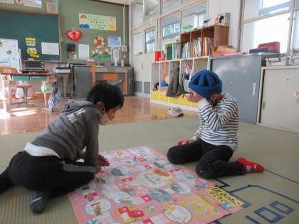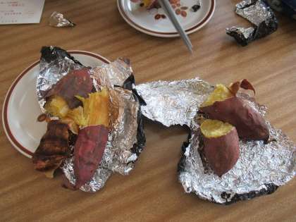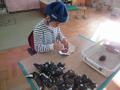 秋に収穫したさつまいもで焼き芋を作りました。焼き芋用のアルミホイルに一つずつ包んで焼きました。焼きあがるまでの間に,すごろくをして遊びました。遊び終わると,ちょうど良く,ほくほくの焼き芋ができ上がりました。自分たちで育てたおいもは,とても美味しかったです。
