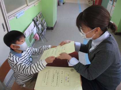 1年生にとってははじめての通知票です。子だもたちは「いったい何を渡されるんだろう?」とドキドキ緊張している様子でしたが,先生に名前を呼ばれると「はい!」と元気に返事をしていました。