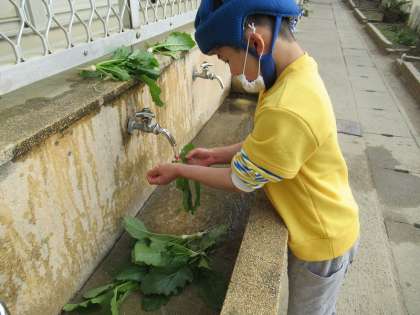 さくらの畑で育てているカブが大きくなってきました。もっと大きくなるように,間引きをしました。間引き菜を水できれいに洗いました。水は冷たかったですが,がんばってきれいにしました。年明けには,大きなカブが収穫できるのを楽しみにしています。