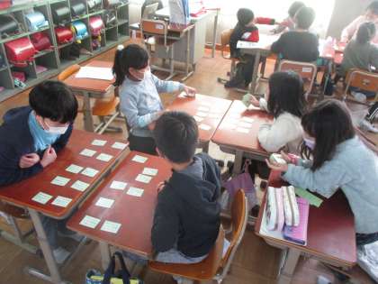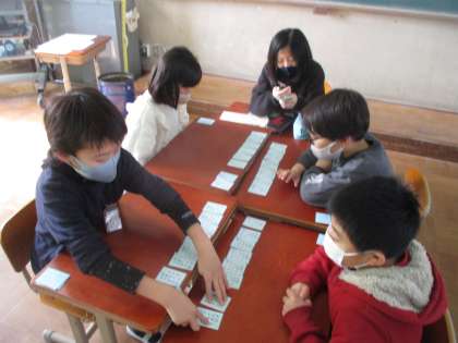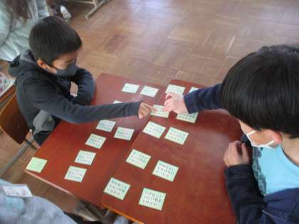 色ごとのチームに分かれて練習しました。がんばって句を覚えてくれていて,上の句を聞いただけで素早く札を取れている子もいました。中には相手の陣地の札まで取っている子もいました。