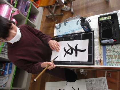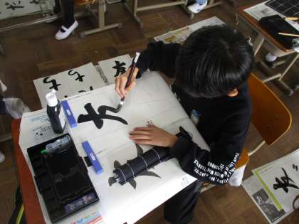 筆をうまく運ぶことに少し苦労しながらも,落ち着いて丁寧に書き上げていました。