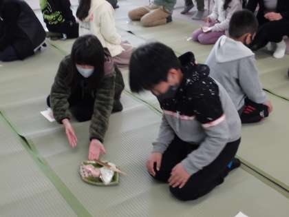七条第三女性会の方に教えていただき,13日(水),14日(木)に茶道体験を行いました。「様々な作法を知れてよかったです。」「お茶は少し苦かったけれど,おいしかったです。」と感想を伝えたり,「どうして茶道をやろうと思ったのですか。」などと質問したりしていました。「自分でお茶をたてるのは,少し難しかったけれど楽しかった。」「思っていたより上手にできた。」「来年の4年生に交じってやりたい。」との感想も。「お茶だけでなく,季節を感じられることも茶道の良さ。」と教えていただきました。またご家庭でも,どんな体験をしたのか聞いてみてください。
