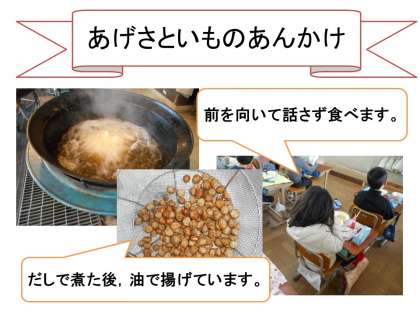 3学期3回目の給食は,牛乳・麦ご飯・平天の煮つけ・あげさといものあんかけでした。あげさといものあんかけは,昆布でだしをとり,みりん・しょうゆでさといもを煮た後,米粉をまぶして油で揚げました。教室で鶏肉が入ったあんかけをかけて食べました。さといもが苦手な1年生の児童も「一口食べてみたら」と声をかけてると,勇気を出して一口食べてみるとおいしかったのか,残りもパクパク食べていました。さといもがほっくりしていて,さといもが苦手な児童にも好評でした。さといもは崩れやすいので,どこまでだしで煮ようかと,調理員さんも頭を悩ませながら作ってくださっていました。