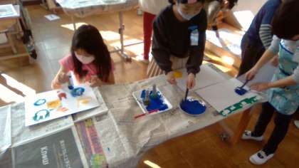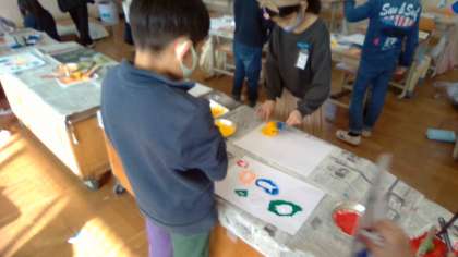 図画工作科の学習で,型紙を作ってローラーなどを使ってうつしてみました。