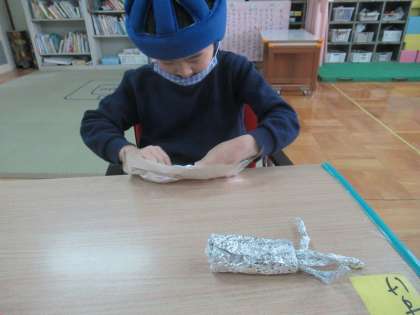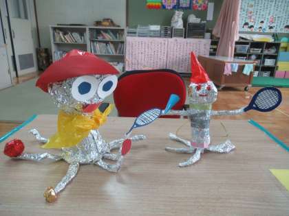 小さな巨匠展に向けて作品を作りました。今年のテーマは「宇宙人」。宇宙人は,足がいっぱいあるイメージ。ということで,アルミホイルを丸めて足や手を作りました。足や手に好きな物を持たせてみました。色々な材料を使って楽しく作りました。次回は,宇宙人の乗り物を作ります。どんな乗り物に乗って宇宙へ行くのか楽しみです。