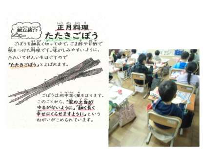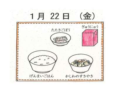 1月22日(金)の給食は,牛乳・玄米ご飯・かしわのすき焼き・たたきごぼうでした。たたきごぼうを,「初めて食べたけどおいしかった」という児童や,「お正月に食べたけど,学校のもおいしい」という児童もいました。ごぼうがしゃきしゃきとして,さっぱりとした酢の味がおいしく好評でした。今日は玄米ご飯だったのですが,なんと全校で残りがゼロでした。3学期に入り,2回目のご飯の残りゼロでうれしいです。