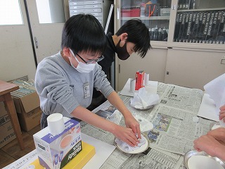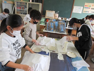 4年生は,図画工作科で「トロトロ,カチコチ・ワールド」の学習をしています。自分で作った土台の上に,液体粘土を浸した布をかぶせ,乾かないうちに好きな形に固めていきます。「うまく全体に染みひんな〜」と初めは苦戦している様子でしたが,思い思いの形を作ることができていました。どんな作品ができるのか楽しみです♪