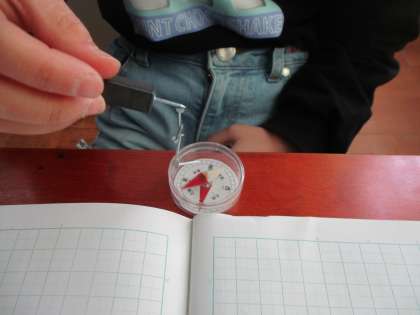 子どもたちは磁石にくぎをくっつけてみたり,それを方位磁針に近づけてみたりといろいろ試していました。