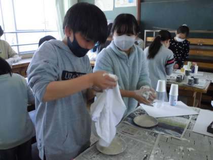 「トロトロ・カチコチワールド」の学習で液体粘土を使いました。「こんな感じなんや。」「おもしろい。」と液体粘土の感触を楽しみながら制作しました。液体粘土を含んだ布をどのように置くのか考えて配置し,乾かしています。今後は,液体粘土の特性を楽しみながら自分の発想を付け足して,どんどん飾っていきます。どんな作品になるのか楽しみです!材料のご協力ありがとうございます。