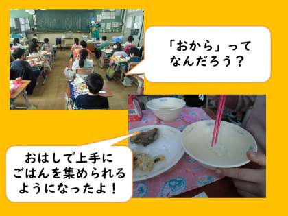今日の給食は,牛乳・ごはん・さばのたつたあげ・おから・白菜の吉野汁でした。カリッとさくっと揚がったさばは,魚が苦手な子にも好評でした。1年生では,おからを初めて食べる子が多くおり,「なにこれ?ポテトサラダ?」と見つめていました。担任から,「節分のお豆と同じ豆からできている栄養たっぷりのおからだ」と説明をされて,初めは減らした児童も,おかわりをしてぱくぱく食べていました。毎年給食には登場するのですが,あまり家庭では出てこないのか,上の学年でも「初めて食べた気がする」と言っていました。食物繊維やカルシウムたっぷりで,成長していく子どもたちにぜひ食べてほしいおかずのひとつです。