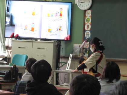 今日は,読み聞かせの日でした。自分で本を読むことにも慣れてきた1年生ですが,読み聞かせの日を,みんな,とても楽しみにしています。昨日の夕方,教室に新しいテレビが入ったところで,今日は,大画面で絵本の世界を楽しみました。図書ボランティアの方々,本当にありがとうございます。