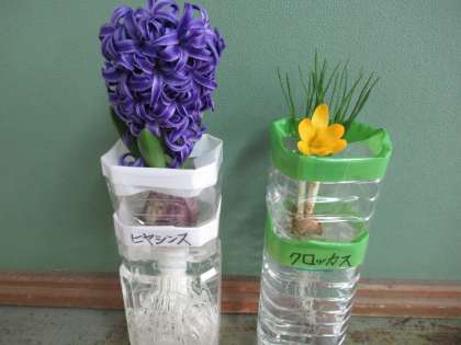 日ごとに暖かくなり,教室で育てている水栽培のヒヤシンス・クロッカスが,ぐんぐんと根をのばし,今週になって花を咲かせました。植木鉢で育てているチューリップも,少しずつ成長しています。