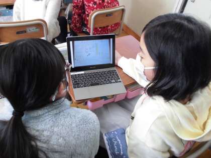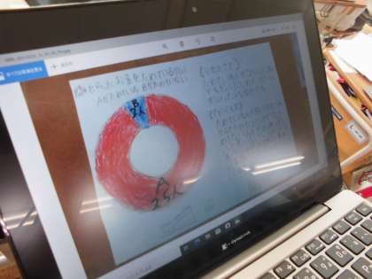 今回は,新しく導入されたタブレット端末を使っての発表に挑戦しました。これまでに使っていたコンピュータールームのタブレットのログインは慣れていてスムーズですが,今回は自分のIDやパスワードを入力してログインします。繰り返すうちに慣れると思います。ログインできたら,カメラを起動してグループのみんながまとめた分析カードを順番通りに写真に撮りました。それを拡大したりスライドしたりしながら友達に説明しました。