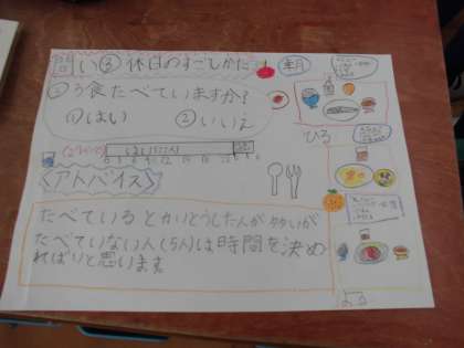 みんなの生活についてアンケート調査をして,分析しました。それぞれ,グラフにまとめてみんなへの生活アドバイスを考えました。