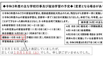 運動会×16日(月) → 〇16日(土)です。