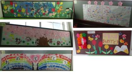 卒業に向けて,校舎内には各学年や委員会,教職員などが作成した