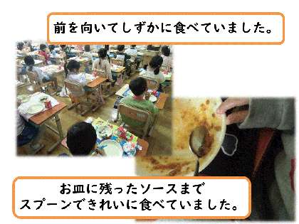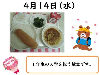 4月14日(水)から今年度も給食が始まりました。入学祝い献立で,牛乳・小型コッペパン・スパゲティのミートソース煮・ほうれん草のソテー・りんごゼリーでした。スパゲティのミートソース煮は、パンにとてもよく合い大人気でした。お皿に残ったソースをパンにつけたり,スプーンですくったりして食べていました。1年生では,初めての給食を楽しみにしている子もいれば,食べる前から「牛乳が苦手やねん」「食べられるかなぁ」とドキドキしている児童もました。「無理に食べなくても,少しずつでいいよ。一口でも,チャレンジできたらいいね。」と声をかけるとホッとした様子でした。ごちそうさまの後は,みんなにこにこしていました。給食ではいろいろな食べ物がでてきますが,少しずついろいろなものにチャレンジしてくれるとうれしいです。